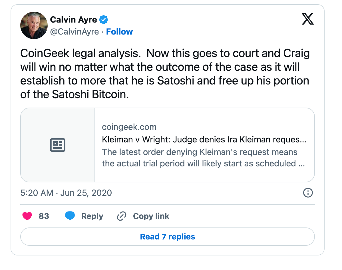 Wrightâs con against Ayre was a form of âadvance fee fraud,â based on his claim to have control of a huge hoard of bitcoin (BTC) mined by Bitcoin creator Satoshi Nakamoto. Ayre was meant to fund Wrightâs activities only long enough to get a slice of that pie, as he has stated outright. This was based not just on Wrightâs false proofs of having been Satoshi, but also a bonkers legal theory that a court could compel the transfer of the Satoshi coins, even if Wright didnât have the keys. This was and is, of course, false.
